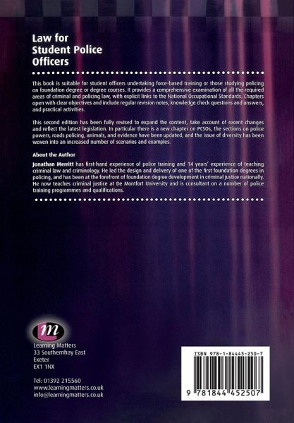 This book provides a comprehensive examination of all the required areas of criminal and policing law, with explicit links to the National Occupational Standards. Chapters open with clear objectives and include regular revision notes, knowledge check questions and answers and practical activities. This second edition has been fully revised to expand the content, take account of recent changes and reflect the latest legislation. In particular there is a new chapter on PCSOs, the sections on police powers, roads policing, animals and evidence have been updated and the issue of diversity has been woven into an increased number of scenarios.