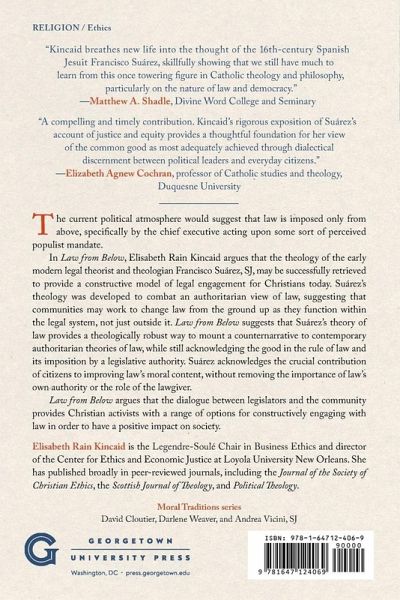 A constructive model of engagement with unjust laws from the ground up The current political atmosphere would suggest that law is imposed only from above, specifically by the chief executive acting upon some sort of perceived populist mandate. In Law from Below, Elisabeth Rain Kincaid argues that the theology of the early modern legal theorist and theologian, Francisco Suáaacute;rez, SJ may be successfully retrieved to provide a constructive model of legal engagement for Christians today. Suárez's theology was developed to combat an authoritarian view of law, suggesting that communities may work to change law from the ground up as they function within the legal system, not just outside it. Law from Below suggests that Suárez's theory of law provides a theologically robust way to mount a counter-narrative to contemporary authoritarian theories of law, while still acknowledging the good in the rule of law and its imposition by a legislative authority. Suárez acknowledges the crucial contribution of citizens to improving law's moral content, without removing the importance of law's own authority or the role of the lawgiver. Law from Below argues that the dialogue between legislators and the community provides Christian activists with a range of options for constructively engaging with law in order to have a positive impact on society.