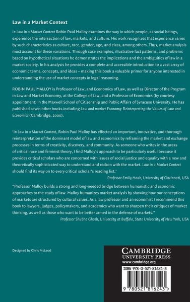 In Law in a Market Context Robin Paul Malloy examines the way in which people, as social beings, experience the intersection of law, markets, and culture. His work recognizes that experience varies by such characteristics as culture, race, gender, age, and class, among others. Thus, market analysis must account for these variations. Through case examples, illustrative fact patterns, and problems based on hypothetical situations he demonstrates the implications and the ambiguities of law in a market society. In his analysis he provides a complete and accessible introduction to a vast array of economic terms, concepts, and ideas - making this book a valuable primer for anyone interested in understanding the use of market concepts in legal reasoning.