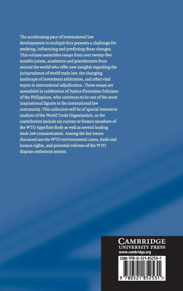 The accelerating pace of international law developments in multiple fora present a challenge for studying, influencing, and predicting these changes. This volume assembles essays from notable jurists, academics, and practitioners from around the world who offer new insights regarding the jurisprudence of world trade law, the changing landscape of investment arbitration, and other vital topics in international adjudication. These essays are assembled in celebration of Justice Florentino Feliciano of The Philippines, who continues to be one of the most inspirational figures in the international law community. This collection will be of special interest to analysts of the World Trade Organization as the contributors include six current or former members of the WTO Appellate Body, as well as several leading trade law commentators. Among the key issues discussed are the WTO environmental cases, trade and human rights, and potential reforms of the WTO dispute system.