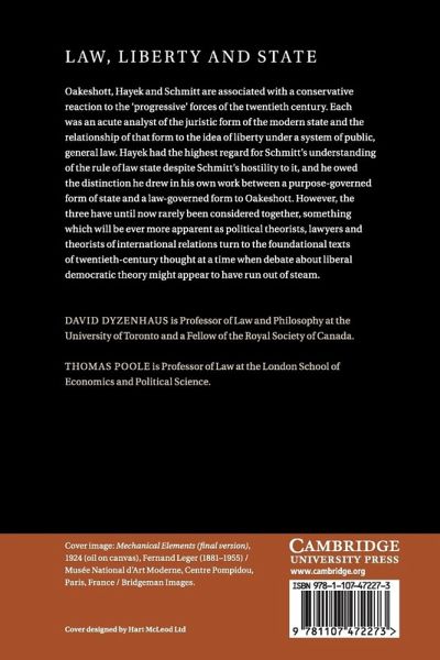 Oakeshott, Hayek and Schmitt are associated with a conservative reaction to the 'progressive' forces of the twentieth century. Each was an acute analyst of the juristic form of the modern state and the relationship of that form to the idea of liberty under a system of public, general law. Hayek had the highest regard for Schmitt's understanding of the rule of law state despite Schmitt's hostility to it, and he owed the distinction he drew in his own work between a purpose-governed form of state and a law-governed form to Oakeshott. However, the three have until now rarely been considered together, something which will be ever more apparent as political theorists, lawyers and theorists of international relations turn to the foundational texts of twentieth-century thought at a time when debate about liberal democratic theory might appear to have run out of steam.