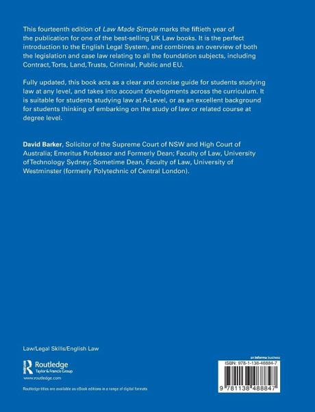 This fourteenth edition of Law Made Simple marks the fiftieth year of the publication for one of the best-selling UK Law books. It is the perfect introduction to the English Legal System, and combines an overview of both the legislation and case law relating to all the foundation subjects, including Contract, Torts, Land, Trusts, Criminal, Public and EU.