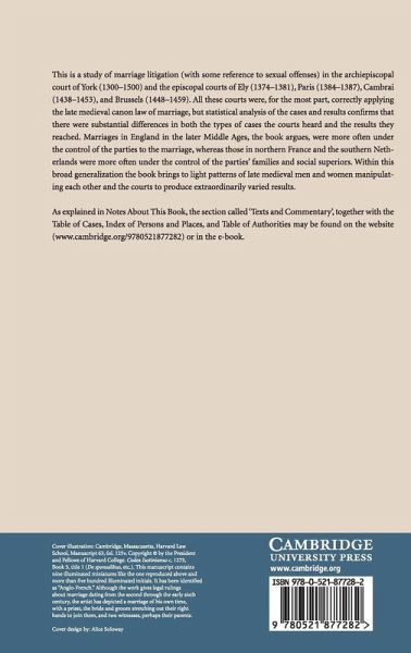 This is a study of marriage litigation (with some reference to sexual offenses) in the archiepiscopal court of York (1300(?)1;1500) and the episcopal courts of Ely (1374(?)1;1381), Paris (1384(?)1;1387), Cambrai (1438(?)1;1453), and Brussels (1448(?)1;1459). All these courts were, for the most part, correctly applying the late medieval canon law of marriage, but statistical analysis of the cases and results confirms that there were substantial differences both in the types of cases the courts heard and the results they reached. Marriages in England in the later middle ages were often under the control of the parties to the marriage, whereas those in northern France and southern Netherlands were often under the control of the parties' families and social superiors. Within this broad generalization the book brings to light patterns of late medieval men and women manipulating each other and the courts to produce extraordinarily varied results.