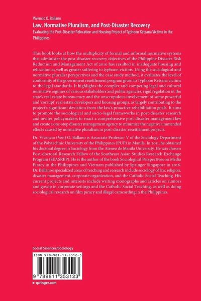 This book looks at how the multiplicity of formal and informal normative systems that actualize the post-disaster recovery goals of the country's Disaster Risk Reduction and Management Act of 2010 has resulted in the inadequate housing and relocation of Typhoon Ketsana victims in the Philippines. Using the sociological and normative pluralist perspectives and the case study method, it evaluates the level of conformity of the components of the housing project according to international conventions and legal standards. It highlights the negative unintended consequences caused by the complex normative regimes of various competing stakeholders, rigid real estate regulation, and the unscrupulous involvement of powerful and 'corrupt' real estate developers and housing groups as largely contributing to the project's deviation from the law's proactive objectives. This book attempts to promote the socio-legal perspectives which have long been overlooked in disaster research. Finally,it invites policymakers to enact a comprehensive disaster law and create a one-stop disaster management agency to improve the long-term rehabilitation of disaster victims in developing countries such as the Philippines.
