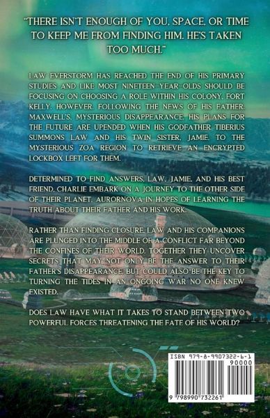 Law Everstorm has reached the end of his primary studies and, like most nineteen-year-olds, should be focusing on choosing a role within his colony, Fort Kelly. However, following the news of his father's mysterious disappearance, his plans for the future are upended when his godfather, Tiberius, summons Law and his twin sister, Jamie, to the mysterious Zoa region to retrieve an encrypted lockbox that was left for them. Determined to find answers, Law, his twin sister Jamie, and his best friend Charlie embark on a journey to the other side of their planet, Aurornova, hoping to learn the truth about their father and his work. Rather than finding closure, Law and his companions are plunged into a conflict far beyond the confines of their world. Together, they uncover secrets that may not only be the answer to their father's disappearance but could also be the key to turning the tides in an ongoing war no one knew existed. Does Law have what it takes to stand between two powerful forces threatening the fate of his world?
