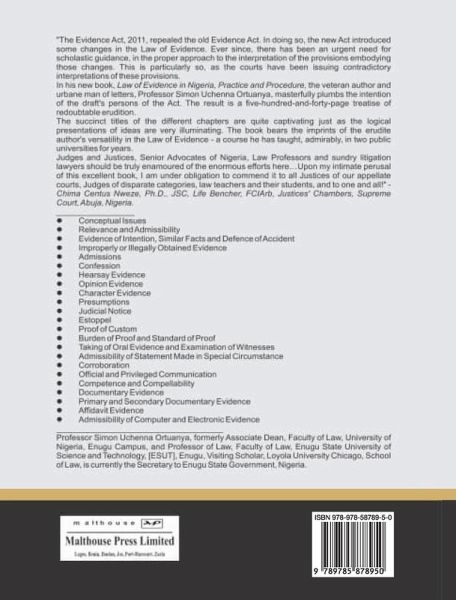 The Evidence Act, 2011, repealed the old Evidence Act. In doing so, the new Act introduced some changes in the Law of Evidence. Ever since, there has been an urgent need for scholastic guidance, in the proper approach to the interpretation of the provisions embodying those changes. This is particularly so, as the courts have been issuing contradictory interpretations of these provisions. In his new book, Law of Evidence in Nigeria: Practice and Procedure, the veteran author and urbane man of letters, Professor Simon Uchenna Ortuanya, masterfully plumbs the intention of the draft's persons of the Act. The result is a five-hundred-and-forty-page treatise of redoubtable erudition. The succinct titles of the different chapters are quite captivating just as the logical presentations of ideas are very illuminating. The book bears the imprints of the erudite author's versatility in the Law of Evidence - a course he has taught, admirably, in two public universities years.