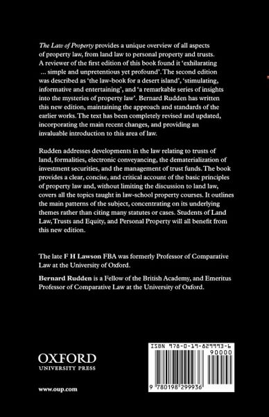 This is a new edition of our well-established Property text in the renowned Clarendon Law Series. It is completely revised and updated to incorporate all recent legislative changes and provides a clear and critical account of the basic principles of the law of property. It provides both a succinct and thoughtful overview of the subject for those coming to it for the first time (e.g. as pre-course reading) and also pulls together themes and raises thought-provokinginsights and synergies for those reading it after they have completed both property heads.