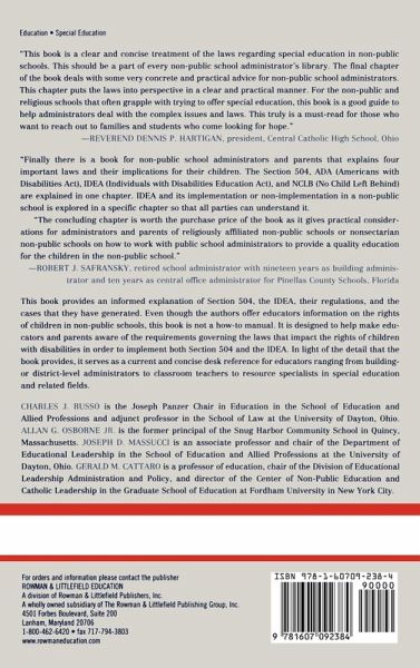 The Law of Special Education and Non-Public Schools provides an informed explanation of Section 504, the IDEA, their regulations, and the cases that they have generated. Even though, the authors offer educators information on the rights of children in non-public schools, this book is not a how-to manual. It is designed to help make educators and parents aware of the requirements governing the laws that impact the rights of children with disabilities in order to implement both Section 504 and the IDED. In light of the detail that the book provides, it serves as a current and concise desk reference for educators ranging from building or district level administrators to classroom teachers to resource specialists in special education and related fields.