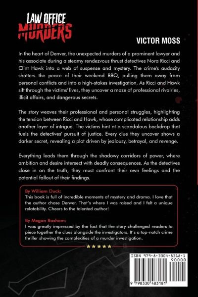 In the heart of Denver, the unexpected murders of a prominent lawyer and his associate during a steamy rendezvous thrust detectives Nora Ricci and Clint Hawk into a web of suspense and mystery. The crime's audacity shatters the peace of their weekend BBQ, pulling them away from personal conflicts and into a high-stakes investigation. As Ricci and Hawk sift through the victims' lives, they uncover a maze of professional rivalries, illicit affairs, and dangerous secrets. The story weaves their professional and personal struggles, highlighting the tension between Ricci and Hawk, whose complicated relationship adds another layer of intrigue. The victims hint at a scandalous backdrop that fuels the detectives' pursuit of justice. Every clue they uncover shows a darker secret, revealing a plot driven by jealousy, betrayal, and revenge. Everything leads them through the shadowy corridors of power, where ambition and desire intersect with deadly consequences. As the detectives close in on the truth, they must confront their own feelings and the potential fallout of their findings.