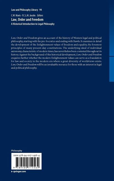 Chapter 1 Legal Philosophy: The Most Important Controversies; Maris.- Chapter 2 Antiquity and the Middle Ages; Van der Vliet (2.1-2.4, with contributions by Maris), Jacobs (2.5-2.8, with contributions by Van der Vliet).- Chapter 3 The Commencement of the Modern Age; Den Hartogh, with an introduction by Maris.- Chapter 4 Hobbes, Locke and Spinoza; Den Hartogh (4.1, 4.2, 4.4), Jacobs (4.3).- Chapter 5 Eighteenth-Century French Enlightenment; Kaptein (5.1-5.7; 5.6 partly by Maris).- Chapter 6 The Synthesis of Kant; Maris (6.1, 6.2, 6.5), Jacobs (6.3, 6.4.3, 6.6), Van der Vliet (6.4.1, 6.4.2).- Chapter 7 Nineteenth Century; Maris (7.1, 7.4.1-7.4.5, 7.4.7, 7.5), Jacobs (7.2, 7.4.6), Van Erp (7.3).- Chapter 8 Twentieth Century; 1900-1945: Maris (8.1, 8.3-8.5), De Ville (8.2).- Chapter 9 Twentieth Century; 1945-2000; Maris (9.1-9.4), De Ville (9.5).- Chapter 10 Conclusion: Law, Order and Freedom; Jacobs (10.1-10.5, 10.9-10.10, with contributions by Maris), Maris (10.6-10.8).- Bibliography.- Index of Names.