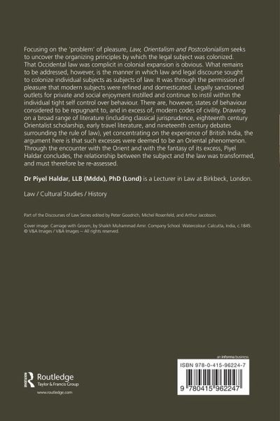 Focusing on the 'problem' of pleasure Law, Orientalism and Postcolonialism uncovers the organizing principles by which the legal subject was colonized. That occidental law was complicit in colonial expansion is obvious. What remains to be addressed, however, is the manner in which law and legal discourse sought to colonize individual subjects as subjects of law. It was through the permission of pleasure that modern Western subjects were refined and domesticated. Legally sanctioned outlets for private and social enjoyment instilled and continue to instil within the individual tight self-control over behaviour. There are, however, states of behaviour considered to be repugnant to, and in excess of, modern codes of civility. Drawing on a broad range of literature, (including classical jurisprudence, eighteenth century Orientalist scholarship, early travel literature, and nineteenth century debates surrounding the rule of law), yet concentrating on the experience of British India, the argument here is that such excesses were deemed to be an Oriental phenomenon. Through the encounter with the Orient and with the fantasy of its excess, Piyel Haldar concludes, the relationship between the subject and the law was transformed, and must therefore be re-assessed.