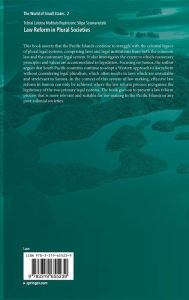 This book asserts that the Pacific Islands continue to struggle with the colonial legacy of plural legal systems, comprising laws and legal institutions from both the common law and the customary legal system. It also investigates the extent to which customary principles and values are accommodated in legislation. Focusing on Samoa, the author argues that South Pacific countries continue to adopt a Western approach to law reform without considering legal pluralism, which often results in laws which are unsuitable and irrelevant to Samoa. In the context of this system of law making, effective law reform in Samoa can only be achieved where the law reform process recognises the legitimacy of the two primary legal systems. The book goes on to present a law reform process that is more relevant and suitable for law making in the Pacific Islands or any post-colonial societies.
