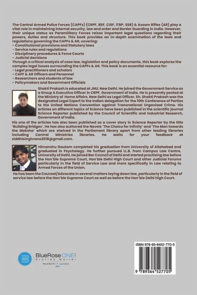 The Central Armed Police Forces (CAPFs) - including CRPF, BSF, CISF, ITBP, and SSB - along with Assam Rifles (AR), are critical in maintaining India's internal security, law, order, and border defense. Their status as paramilitary forces, however, raises key legal questions about their authority, responsibilities, and structure. This book offers a comprehensive analysis of the laws and regulations governing the CAPFs and AR, covering constitutional provisions, statutory laws, service rules, disciplinary processes, and force courts. It also provides insights into judicial decisions that shape the legal framework for these forces. This book addresses the complex legal issues affecting the CAPFs and AR by examining case law, legislation, and policy documents. It is a valuable resource for legal professionals, CAPF & AR personnel, researchers, students, policymakers, and government officials.