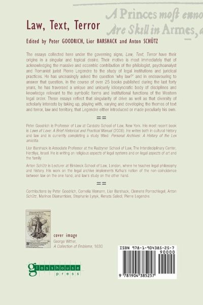 The essays collected here under the governing signs, Law, Text, Terror have their origins in a singular and topical desire. Their motive is most immediately that of acknowledging the massive and eccentric contribution of the philologist, psychoanalyst and Romanist jurist Pierre Legendre to the study of legal institutions and juridical practices. He has unceasingly asked the question 'why law?' and in endeavouring to answer that question, in the course of over twenty-five books published during the last forty years, he has traversed a unique and uniquely idiosyncratic body of disciplines and knowledges relevant to the symbolic forms and institutional functions of the Western legal order. These essays reflect that singularity of drive as well as that diversity of scholarly interests by taking up, playing with, varying and developing the themes of text and terror, law and territory, that Legendre either introduced or made peculiarly his own.