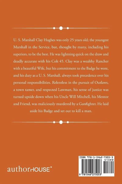 U. S. Marshall Clay Hughes was only 25 years old; the youngest Marshall in the Service, but, thought by many, including his superiors, to be the best. He was lightning quick on the draw and deadly accurate with his Colt 45. Clay was a wealthy Rancher with a beautiful Wife, but his commitment to the Badge he wore, and his duty as a U. S. Marshall, always took precedence over his personal responsibilities. Relentless in the pursuit of Outlaws, a town tamer, and respected Lawman, his sense of justice was turned upside down when his Uncle Will Mitchell, his Mentor and Friend, was maliciously murdered by a Gunfighter. He laid aside his Badge and set out to kill a man.