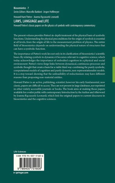 Howard Pattee is a physicist who for many years has taken his own path in studying the physics of symbols, which is now a foundation for biosemiotics. By extending von Neumann's logical requirements for self-replication, to the physical requirements of symbolic instruction at the molecular level, he concludes that a form of quantum measurement is necessary for life. He explains why all non-dynamic symbolic and informational controls act as special (allosteric) constraints on dynamical systems. Pattee also points out that symbols do not exist in isolation but in coordinated symbol systems we call languages. Such insights turn out to be necessary to situate biosemiotics as an objective scientific endeavor. By proposing a way to relate quiescent symbolic constraints to dynamics, Pattee's work builds a bridge between physical, biological, and psychological models that are based on dynamical systems theory. Pattee's work awakes new interest in cognitive scientists, where his recognition of the necessary separation-the epistemic cut-between the subject and object provides a basis for a complementary third way of relating the purely symbolic, computational models of cognition and the purely dynamic, non-representational models. This selection of Pattee's papers also addresses several other fields, including hierarchy theory, artificial life, self-organization, complexity theory, and the complementary epistemologies of the physical and biological sciences.