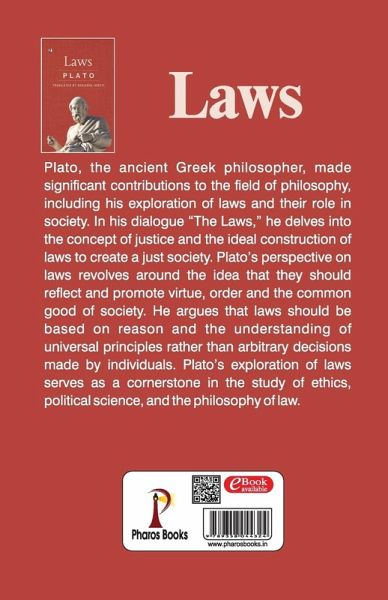 Plato, the ancient Greek philosopher, made significant contributions to the field of philosophy, including his exploration of laws and their role in society. In his dialogue "The Laws," he delves into the concept of justice and the ideal construction of laws to create a just society. Plato's perspective on laws revolves around the idea that they should reflect and promote virtue, order and the common good of society. He argues that laws should be based on reason and the understanding of universal principles rather than arbitrary decisions made by individuals. Plato's exploration of laws serves as a cornerstone in the study of ethics, political science, and the philosophy of law.