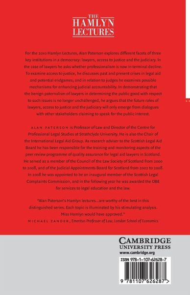 For the 2010 Hamlyn Lectures, Alan Paterson explores different facets of three key institutions in a democracy: lawyers, access to justice and the judiciary. In the case of lawyers he asks whether professionalism is now in terminal decline. To examine access to justice, he discusses past and present crises in legal aid and potential endgames and in relation to judges he examines possible mechanisms for enhancing judicial accountability. In demonstrating that the benign paternalism of lawyers in determining the public good with respect to such issues is no longer unchallenged, he argues that the future roles of lawyers, access to justice and the judiciary will only emerge from dialogues with other stakeholders claiming to speak for the public interest.