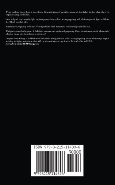 When paralegal omega Ryan is moved onto his crush's team, it was only a matter of time before the law office rule of no employee dating was broken. Now, as Ryan's boss, wealthy alpha law firm partner Marcus has a secret pregnancy and relationship with Ryan to hide or they'll both lose their jobs. But the secret pregnancy is the least of their problems when Ryan's ultra conservative parents find out... Workplace unresolved tension. A forbidden romance. An unplanned pregnancy. Can a commitment-phobic alpha and a reluctant omega seize their chance at happiness? Lawyer's Secret Omega is a 64,000 word non-shifter mpreg romance with a secret pregnancy, secret relationship, surprise wedding, an Alpha to the rescue, time with the adorable baby, steamy times in the boss's office and HEA. Mpreg Non-Shifter M/M Omegaverse