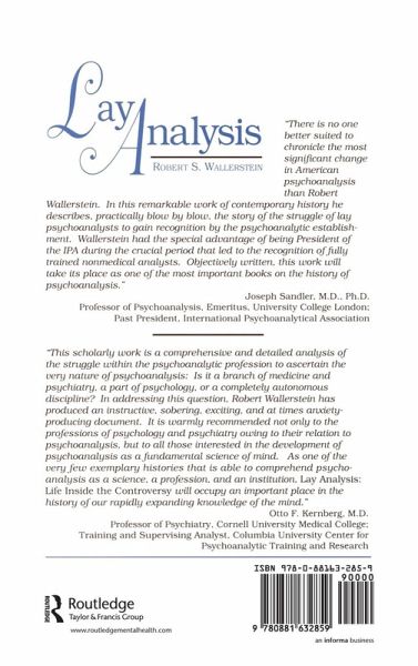Lay Analysis: Life Inside the Controversy chronicles the history of nonmedical analysis in absorbing detail. It begins with the events of 1910 in Europe and America that initiated their divergent attitudes and policies regarding lay analysis, proceeds to the unfolding struggles over this issue on both sides of the Atlantic, and reviews the halting efforts of the APsaA, beginning in the 1950s, to reassess its opposition to lay analysis and make some provision for the training of nonmedical practitioners. Wallerstein's illuminating treatment of the response of American nonphysician therapists to the APsaA's policy - the manner in which they managed to obtain clinical psychoanalytic training despite the APsaA's prohibition - forms a fascinating story within his grand narrative. The book culminates in a comprehensive review of the lawsuit of March 1985 in which four clinical psychologists, representing a stated class of several thousand colleagues and fully supported by the American Psychological Association, brought suit against the APsaA and IPA, hoping in this way to force a change in the APsaA's policies regarding the training of lay practitioners. Wallerstein, drawing on the voluminous documentation to which he had full access - memoranda, correspondence, depositions, legal briefs, and phone conversations - reviews the three-and-a-half-year history of the lawsuit. He concludes his narrative with a measured and thoughtful assessment of the impact of the settlement on psychoanalysis today: the changes it has brought about within organized psychoanalysis and the meaning of those changes for psychoanalysis as a discipline. Given Wallerstein's comprehensive scholarship, his admirable even-handedness, and his unique participatory role in the lay analysis controversy over the course of his career, it is unsurprising that Lay Analysis: Life Inside the Controversy should achieve distinction as a major contribution to the institutional history of psychoanalysis.