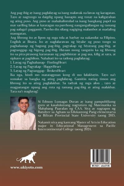 Ang pag-ibig ay isang paglalayag sa isang malawak na lawas ng karagatan. Tayo ay nagtungo sa daigdig upang hanapin ang tunay na kaligayahan ng ating puso. Ang puso ay mahahalintulad sa isang bangkang papel na may sariling lakas at katatagan na parehong nangangailangan ng tamang pag-aalaga't paggamit. Pareho din silang nagiging malambot at madaling masugatan. Ang librong ito ay lipon ng mga tula at baybay na nakasulat sa Filipino, English at Bisaya. Ito ay naglalarawan ng biyahe ng puso tungo sa paghahanap ng bagong pag-ibig, pagyakap ng biyayang pag-ibig, at pagtanggap ng bigong pag-ibig. Hayaan mong tangayin ka ng librong ito sa pira-pirasong karanasan ng paghihintay at pag-asa, kilig at saya, at siphayo at paghilom. Nahahati ito sa tatlong paglalayag; 1. Layag ng Paghahanap - FindingHeart 2. Layag ng Pagyakap - HappyHeart 3. Layag ng Pagtanggap - BrokenHeart Ika nga, hindi mo matatagpuan kung di mo lalakbayin. Tayo na't sumakay sa bangka ng ating paglalayag. Gamitin nating timon ang librong ito sa ating paglalakbay. Sa tadyak ng mga alon , tayo ay magpatangay upang ang ruta ng tamang pag-ibig ay ating malakbay. Tara na't maglayag!