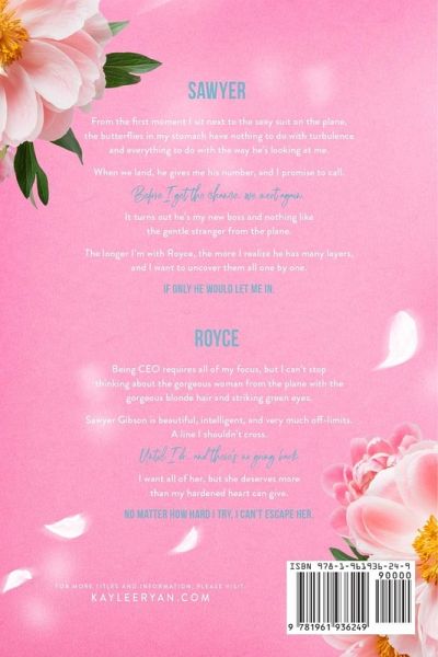Sawyer From the first moment I sit next to the sexy suit on the plane, the butterflies in my stomach have nothing to do with turbulence and everything to do with the way he's looking at me. When we land, he gives me his number, and I promise to call. Before I get the chance, we meet again. It turns out he's my new boss and nothing like the gentle stranger from the plane. The longer I'm with Royce, the more I realize he has many layers, and I want to uncover them all one by one. If only he would let me in. Royce Being CEO requires all of my focus, but I can't stop thinking about the gorgeous woman from the plane with the gorgeous blonde hair and striking green eyes. Sawyer Gibson is beautiful, intelligent, and very much off-limits. A line I shouldn't cross. Until I do... and there's no going back. I want all of her, but she deserves more than my hardened heart can give. No matter how hard I try, I can't escape her.