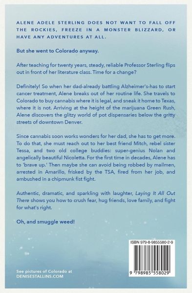 Denise Stallins taught literature for Alamo Colleges in San Antonio for more than 25 years. She earned her bachelor's degree from the University of Texas at Austin and her master's in Professional Writing from the University of Southern California. Denise likes to travel, hike, garden, cook, and walk small bossy dogs. Laying It All Out There is her first novel. See pictures from Colorado on her website at denisestallins.com