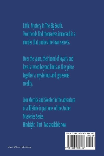 Archer Mystery series begins with two young boys making a grisly discovery one hot summer day that unravels the town secrets. Merrick and Skeeter test the bonds of love and loyalty through the years as they sleuth their way to understanding the pain and triumphs one goes through to become a man. Archer Mystery series continues the bonds of family and friendship in Part II, Hindsight and Part III, No Place Like Home where even greater danger and evil challenge our heroes.