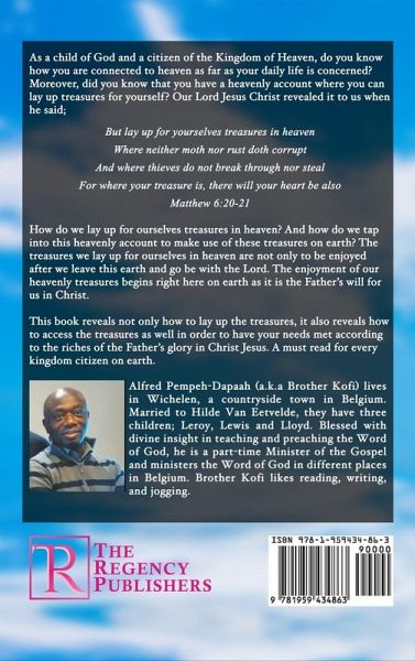 As a child of God and a citizen of the Kingdom of Heaven, do you know how you are connected to heaven as far as your daily life is concerned? Moreover, did you know that you have a heavenly account where you can lay up treasures for yourself? Our Lord Jesus Christ revealed it to us when he said; But lay up for yourselves treasures in heaven Where neither moth nor rust doth corrupt And where thieves do not break through nor steal For where your treasure is, there will your heart be also Matthew 6:20-21 How do we lay up for ourselves treasures in heaven? And how do we tap into this heavenly account to make use of these treasures on earth? The treasures we lay up for ourselves in heaven are not only to be enjoyed after we leave this earth and so be with the Lord. The enjoyment of our heavenly treasures begins right here on earth as it is the Father's will for us in Christ. This book reveals not only how to lay up the treasures, it also reveals how to access the treasures as well in order to have your needs met according to the riches of the Father's glory in Christ Jesus. A must read for every kingdom citizen on earth.