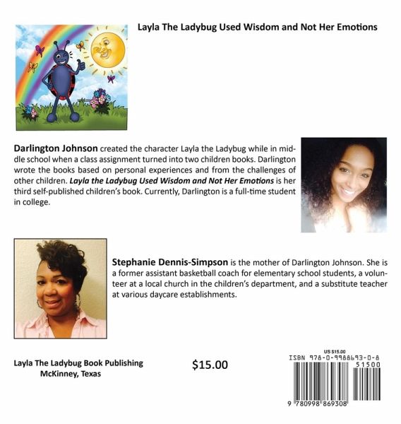 Layla the Ladybug Used Wisdom and Not Her Emotions Authors Darlington Johnson and Stephanie Simpson have noticed many children reacting with their emotions first, and then there are the consequences for their reactions. They decided to write a children's book to encourage children to try to think out the situation thoroughly before reacting, and using the character Layla the Ladybug to help demonstrate how to handle a dilemma. Layla didn't react to her emotions; instead she found a way to fix the problem and have a better outcome.