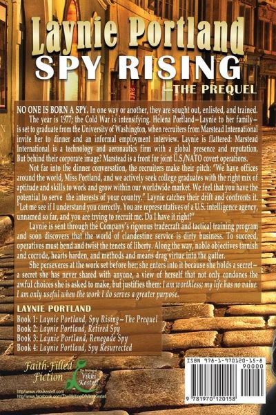 No one is born a spy. In one way or another, every "righteous" clandestine operative is sought out, enlisted, and trained for the difficult and often terrible work intended to ensure that the principles of freedom triumph over ideologies that seek to dominate and enslave. The year is 1977; the Cold War is intensifying. Helena Portland-Laynie to her family-is set to graduate from the University of Washington, when recruiters from Marstead International invite her to dinner and an informal employment interview. Laynie is flattered: Marstead International is a technology and aeronautics firm with a global presence and reputation. But behind their corporate image? Marstead is a front for joint U.S./NATO covert operations. Not far into the dinner conversation, the recruiters make their pitch: "We have offices around the world, Miss Portland, and we actively seek college graduates with the right mix of aptitude and skills to work and grow within our worldwide market. Actually, we have been observing you for some time. We feel that you have the potential to serve . . . the interests of your country." Laynie catches their drift and confronts it. "Let me see if I understand you correctly. You are representatives of a U.S. intelligence agency, unnamed so far, and you are trying to recruit me. Do I have it right?" When Laynie accepts Marstead's offer, she is sent through the Company's rigorous tradecraft and tactical training program. Laynie soon discovers that the world of clandestine service is dirty business. To succeed, operatives must bend and twist the tenets of liberty. Along the way, noble objectives tarnish and corrode, hearts harden, and methods and means drag virtue into the gutter. Laynie perseveres at the work set before her; she enters into it because she holds a secret-a secret she has never shared with anyone, a view of herself that not only condones the awful choices she is asked to make, but justifies them: I am worthless; my life has no value. I am only useful when the work I do serves a greater purpose. Laynie Portland Book 1: Laynie Portland, Spy Rising-The Prequel Book 2: Laynie Portland, Retired Spy Book 3: Laynie Portland, Renegade Spy Book 4: Laynie Portland, Spy Resurrected