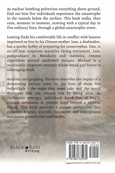 "Thrilling, captivating, and addictive right from the start." –Red Headed Book Lover As nuclear bombing pulverizes everything on the surface, find out how five individuals experience catastrophe in tunnels below the surface. This book walks, then runs, moment to moment, starting with a typical day in five lives through a global catastrophic event. Imagine if every decision you make at the start of your day would have far-reaching consequences. Luming is unsure about his comfortable life. Jane, a dealmaker, has a quirky hobby of preparing for catastrophes. Dan, an off-beat corporate executive facing retirement. Lois, postgraduate in Mandarin and statistics, creates algorithms around spiderweb designs. The final character is a corporate attorney, Michael. The story clearly describes the impact of multiple nuclear bombs on individuals and the steps they take, the information they process and the moral dilemmas that are created from being alive. This book presents a unique perspective into corporate America and underground marijuana growers and seed-savers.