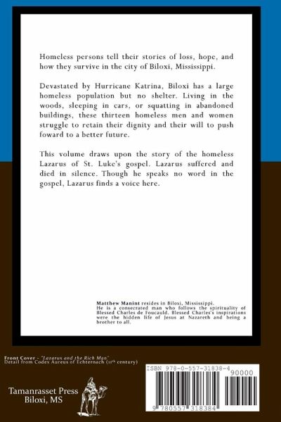 Homeless persons tell their stories of loss, hope, and how they survive in the city of Biloxi, Mississippi. Devastated by Hurricane Katrina, Biloxi has a large homeless population but no shelter. Living in the woods, sleeping in cars, or squatting in buildings, these thirteen homeless men and women struggle to retain their dignity and their will to push forward to a better future. This volume draws upon the story of the homeless Lazarus of St. Luke's gospel. Lazarus suffered and died in silence. Though he speaks no word in the Gospel, Lazarus finds a voice here.
