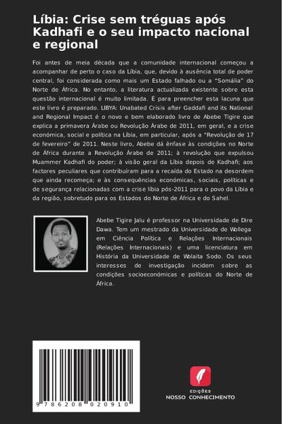 Foi antes de meia década que a comunidade internacional começou a acompanhar de perto o caso da Líbia, que, devido à ausência total de poder central, foi considerada como mais um Estado falhado ou a ¿Somáliä do Norte de África. No entanto, a literatura actualizada existente sobre esta questão internacional é muito limitada. É para preencher esta lacuna que este livro é preparado. LIBYA: Unabated Crisis after Gaddafi and its National and Regional Impact é o novo e bem elaborado livro de Abebe Tigire que explica a primavera Árabe ou Revolução Árabe de 2011, em geral, e a crise económica, social e política na Líbia, em particular, após a ¿Revolução de 17 de fevereiro¿ de 2011. Neste livro, Abebe dá ênfase às condições no Norte de África durante a Revolução Árabe de 2011; à revolução que expulsou Muammer Kadhafi do poder; à visão geral da Líbia depois de Kadhafi; aos factores peculiares que contribuíram para a recaída do Estado na desordem que ainda recomeça; e às consequências económicas, sociais, políticas e de segurança relacionadas com a crise líbia pós-2011 para o povo da Líbia e da região, sobretudo para os Estados do Norte de África e do Sahel.