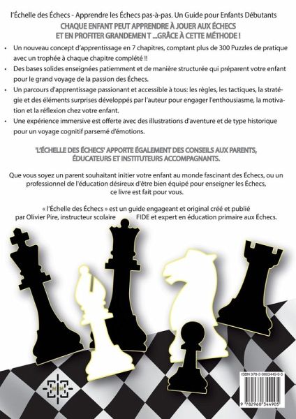 "L'Échelle des Échecs: Apprendre les Échecs Pas-à-pas. Un Guide pour Enfants Débutants" est un ouvrage original et captivant offrant un apprentissage simple, structuré et ludique des Échecs, aux enfants de 6 à 12 ans. La plupart des livres d'échecs pour enfants débutants, focalisés beaucoup trop sur la théorie du jeu et la performance du joueur. Ce qui souvent détourne l'élève du plaisir de jouer. L'échelle des échecs se différencie par le temps offert a chaque étape de l'apprentissage: de la théorie, des exercises pratiques, des illustrations nourrissent ce monde mystérieux et aventurier, et des tests et trophées a chaque chapitre. Le tout avec une approche structurée, pas-a-pas, pratique, ludique, illustrée et enthousiasmante, afin de captiver le jeune lecteur. L'Échelle des Échecs, c'est : Des Bases Solides: Il fournit à votre enfant les notions essentielles du jeu, en prenant le temps d'expliquer patiemment les bases d'un parcours échiquéen excitant. Un Apprentissage Enthousiasmant: Les pièces du Jeu, la Défense, l'Attaque, mettre le Roi adverse en échec, etc. Tous les éléments nécessaire sont transmis au travers due 7 chapitres. Chaque chapitre est composé d'une nouvelle théorie, d'exercises la mettant en pratique, de petits tests, et d'un trophée confirmant que l'élève a bien saisit la nouvelle matière. Ce cheminement d'apprentissage clair est ce qui différencie l'échelle des échecs des autres livres. L'attention et l'enthousiasme du lecteur vont de pair avec l'apprentissage du jeu. Une Expérience Immersive se produit grâce aux nombreuses illustrations, dans un style historique, original, assurant que votre enfant apprend tout en vivant une aventure cognitive et émotionnelle vibrante. Un Guide pour Tous: *L'Échelle des Échecs* ne profite pas qu'aux enfants. Il offre des conseils précieux pour les parents, les entraîneurs et les enseignants qui souhaitent accompagner l'aventure échiquéenne et mieux soutenir les progrès de leurs enfants. Pour cela, des sujets propres au monde des échecs, parsemant le guide: les horloges d'échecs, l'histoire des échecs, comment organiser un tournoi ou une classe d'échecs, etc. Que vous soyez un parent cherchant à initier votre enfant à l'univers fascinant des échecs ou un professionnel de l'éducation désireux d'enseigner les échecs, *L'Échelle des Échecs* est un choix sérieux, moderne et efficace.