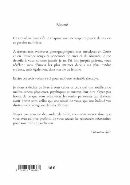RésuméCe troisième livre clôt le chapitre sur une majeure partie de ma vie et pas des moindres.A travers mes aventures photographiques, mes anecdotes en Corse et en Provence toujours ponctuées de rire et de sourire, je me dévoile à vous comme jamais je ne l'ai fait jusqu'à présent, vous révélant mes démons les plus intimes depuis ma plus tendre enfance, mais également dans ma vie de femme.Ecrire ces trois volets a été pour moi une véritable thérapie.Je tiens à dédier ce livre à tous celles et ceux qui ont souffert de maltraitance physique, psychiques et surtout leur dire n'ayez pas honte de ce que vous avez vécu, les seules personnes qui doivent avoir honte sont celles qui ont abusé de vous, qui ont bafoué vos droits, vous plongeant dans la détresse.N'ayez pas peur de demander de l'aide, vous constaterez alors que vous avez au plus profond de vous toutes les ressources nécessaires pour sortir de ce cauchemarGéraldine Vert