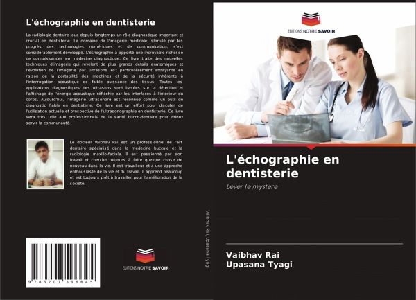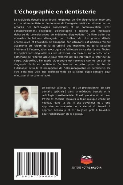 La radiologie dentaire joue depuis longtemps un rôle diagnostique important et crucial en dentisterie. Le domaine de l'imagerie médicale, stimulé par les progrès des technologies numériques et de communication, s'est considérablement développé. L'échographie a apporté une incroyable richesse de connaissances en médecine diagnostique. Ce livre traite des nouvelles techniques d'imagerie qui révèlent de plus grands détails anatomiques et l'évolution de l'imagerie par ultrasons est particulièrement attrayante en raison de la portabilité des machines et de la sécurité inhérente à l'interrogation acoustique de faible puissance des tissus. Toutes les applications diagnostiques des ultrasons sont basées sur la détection et l'affichage de l'énergie acoustique réfléchie par les interfaces à l'intérieur du corps. Aujourd'hui, l'imagerie ultrasonore est reconnue comme un outil de diagnostic fiable en dentisterie. Ce livre est un effort pour discuter de l'utilisation actuelle et prospective de l'ultrasonographie en dentisterie. Ce livre sera très utile aux professionnels de la santé bucco-dentaire pour mieux servir la communauté.