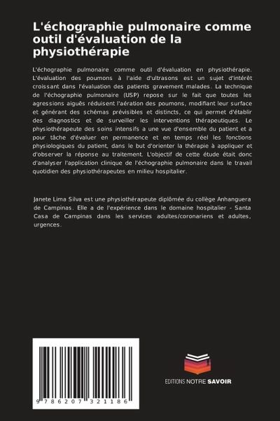 L'échographie pulmonaire comme outil d'évaluation en physiothérapie. L'évaluation des poumons à l'aide d'ultrasons est un sujet d'intérêt croissant dans l'évaluation des patients gravement malades. La technique de l'échographie pulmonaire (USP) repose sur le fait que toutes les agressions aiguës réduisent l'aération des poumons, modifiant leur surface et générant des schémas prévisibles et distincts, ce qui permet d'établir des diagnostics et de surveiller les interventions thérapeutiques. Le physiothérapeute des soins intensifs a une vue d'ensemble du patient et a pour tâche d'évaluer en permanence et en temps réel les fonctions physiologiques du patient, dans le but d'orienter la thérapie à appliquer et d'observer la réponse au traitement. L'objectif de cette étude était donc d'analyser l'application clinique de l'échographie pulmonaire dans le travail quotidien des physiothérapeutes en milieu hospitalier.