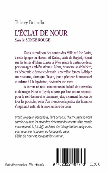 Dans la tradition des contes des Mille et Une Nuits, à cette époque où Haroun Al-Rachid, calife de Bagdad, régnait sur les terres d'Islam, L'ÉCLAT DE NOUR est un conte contemporain qui relate le destin de deux personnages emblématiques : Nour, princesse analphabète, va découvrir le Savoir et devenir la première femme à diriger un royaume, alors que Tayeb, jeune pêcheur homosexuel condamné à la lapidation, deviendra son vizir.À travers cette épopée habitée de merveilles et de magie, Nour et Tayeb, nourris par leur amour respectif pour le roi Hassan et le téméraire Jafar, incarnent l'espoir de tous les possibles, celui d'un monde où la justice des hommes s'inspirerait enfin de la vraie lumière du divin.Grand voyageur, agnostique, libre penseur, Thierry Brunello nous entraîne ici dans les méandres richement documentés d'un monde musulman où la foi s'affranchirait des interprétations religieuses pour redonner le pouvoir au langage du coeur.L'ÉCLAT DE NOUR est son quatrième roman.