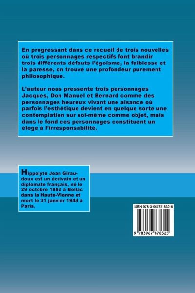 En progressant dans ce recueil de trois nouvelles où trois personnages respectifs font brandir trois différents défauts l'égoïsme, la faiblesse et la paresse, on trouve une profondeur purement philosophique. L'auteur nous pressente trois personnages Jacques, Don Manuel et Bernard comme des personnages heureux vivant une aisance où parfois l'esthétique devient en quelque sorte une contemplation sur soi-même comme objet, mais dans le fond ces personnages constituent un éloge à l'irresponsabilité.