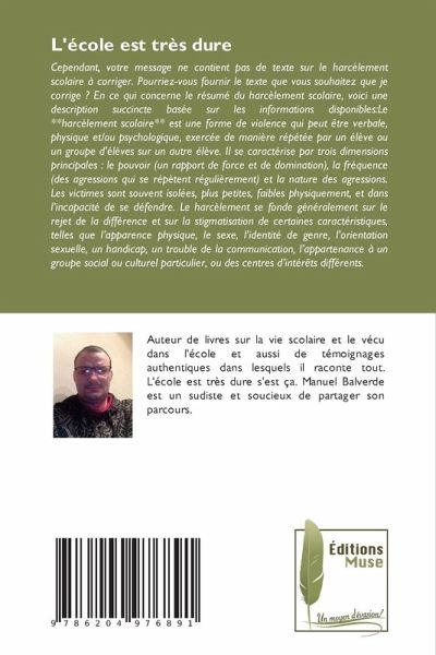 Cependant, votre message ne contient pas de texte sur le harcèlement scolaire à corriger. Pourriez-vous fournir le texte que vous souhaitez que je corrige ? En ce qui concerne le résumé du harcèlement scolaire, voici une description succincte basée sur les informations disponibles:Le **harcèlement scolaire** est une forme de violence qui peut être verbale, physique et/ou psychologique, exercée de manière répétée par un élève ou un groupe d'élèves sur un autre élève. Il se caractérise par trois dimensions principales : le pouvoir (un rapport de force et de domination), la fréquence (des agressions qui se répètent régulièrement) et la nature des agressions. Les victimes sont souvent isolées, plus petites, faibles physiquement, et dans l'incapacité de se défendre. Le harcèlement se fonde généralement sur le rejet de la différence et sur la stigmatisation de certaines caractéristiques, telles que l'apparence physique, le sexe, l'identité de genre, l'orientation sexuelle, un handicap, un trouble de la communication, l'appartenance à un groupe social ou culturel particulier, ou des centres d'intérêts différents.