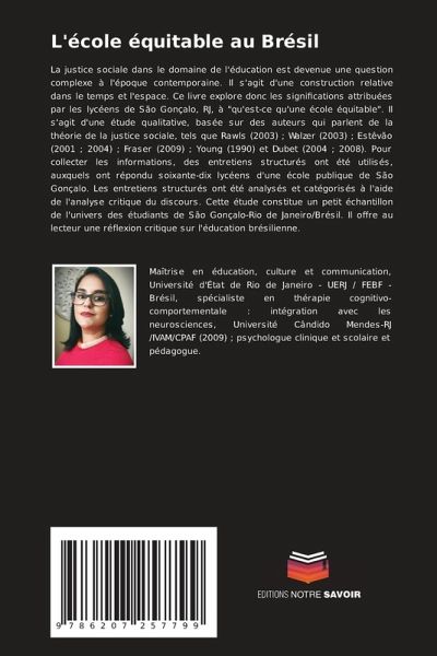La justice sociale dans le domaine de l'éducation est devenue une question complexe à l'époque contemporaine. Il s'agit d'une construction relative dans le temps et l'espace. Ce livre explore donc les significations attribuées par les lycéens de São Gonçalo, RJ, à "qu'est-ce qu'une école équitable". Il s'agit d'une étude qualitative, basée sur des auteurs qui parlent de la théorie de la justice sociale, tels que Rawls (2003) ; Walzer (2003) ; Estêvão (2001 ; 2004) ; Fraser (2009) ; Young (1990) et Dubet (2004 ; 2008). Pour collecter les informations, des entretiens structurés ont été utilisés, auxquels ont répondu soixante-dix lycéens d'une école publique de São Gonçalo. Les entretiens structurés ont été analysés et catégorisés à l'aide de l'analyse critique du discours. Cette étude constitue un petit échantillon de l'univers des étudiants de São Gonçalo-Rio de Janeiro/Brésil. Il offre au lecteur une réflexion critique sur l'éducation brésilienne.