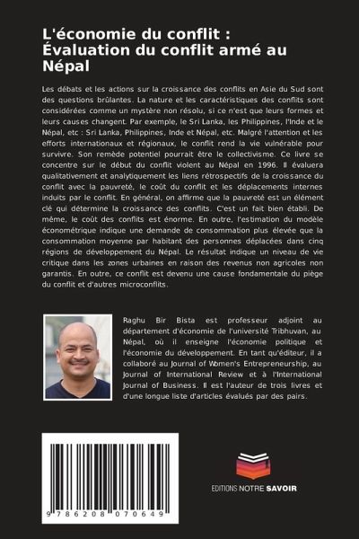 Les débats et les actions sur la croissance des conflits en Asie du Sud sont des questions brûlantes. La nature et les caractéristiques des conflits sont considérées comme un mystère non résolu, si ce n'est que leurs formes et leurs causes changent. Par exemple, le Sri Lanka, les Philippines, l'Inde et le Népal, etc : Sri Lanka, Philippines, Inde et Népal, etc. Malgré l'attention et les efforts internationaux et régionaux, le conflit rend la vie vulnérable pour survivre. Son remède potentiel pourrait être le collectivisme. Ce livre se concentre sur le début du conflit violent au Népal en 1996. Il évaluera qualitativement et analytiquement les liens rétrospectifs de la croissance du conflit avec la pauvreté, le coût du conflit et les déplacements internes induits par le conflit. En général, on affirme que la pauvreté est un élément clé qui détermine la croissance des conflits. C'est un fait bien établi. De même, le coût des conflits est énorme. En outre, l'estimation du modèle économétrique indique une demande de consommation plus élevée que la consommation moyenne par habitant des personnes déplacées dans cinq régions de développement du Népal. Le résultat indique un niveau de vie critique dans les zones urbaines en raison des revenus non agricoles non garantis. En outre, ce conflit est devenu une cause fondamentale du piège du conflit et d'autres microconflits.