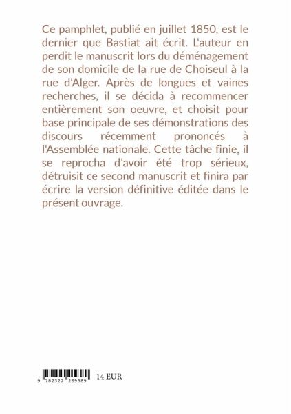 Ce pamphlet, publié en juillet 1850, est le dernier que Bastiat ait écrit. L'auteur en perdit le manuscrit lors du déménagement de son domicile de la rue de Choiseul à la rue d'Alger. Après de longues et vaines recherches, il se décida à recommencer entièrement son oeuvre, et choisit pour base principale de ses démonstrations des discours récemment prononcés à l'Assemblée nationale. Cette tâche finie, il se reprocha d'avoir été trop sérieux, détruisit ce second manuscrit et finira par écrire la version définitive éditée dans le présent ouvrage.