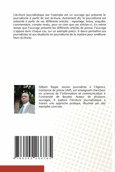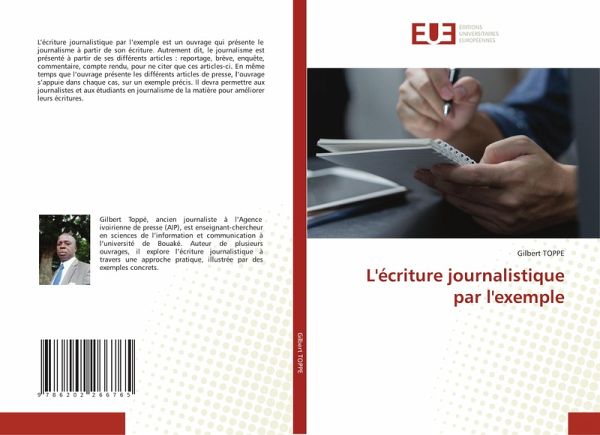 L'écriture journalistique par l'exemple est un ouvrage qui présente le journalisme à partir de son écriture. Autrement dit, le journalisme est présenté à partir de ses différents articles : reportage, brève, enquête, commentaire, compte rendu, pour ne citer que ces articles-ci. En même temps que l'ouvrage présente les différents articles de presse, l'ouvrage s'appuie dans chaque cas, sur un exemple précis. Il devra permettre aux journalistes et aux étudiants en journalisme de la matière pour améliorer leurs écritures.