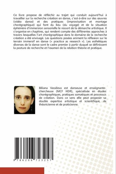 Ce livre propose de réfléchir au trajet qui conduit aujourd'hui à travailler sur la recherche création en danse, c'est-à-dire sur des oeuvres (vidéo danse) et des pratiques (improvisation et montage chorégraphique) qui font du lieu (du voyage) et de la situation éphémère d'immersion sensorielle le ressort de la démarche artistique. Il s'organise en chapitres, qui rendent compte des différentes approches à travers lesquelles l'art chorégraphique dans le domaine de la recherche création a été envisagé. Les questions posées animent la réflexion sur le terrain immersif en danse (« practice as research »). Les esthétiques diverses de la danse sont le cadre premier à partir duquel se définissent la posture de recherche et l'examen de la relation théorie et pratique.