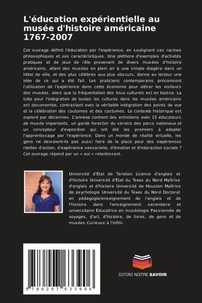 Cet ouvrage définit l'éducation par l'expérience, en soulignant ses racines philosophiques et ses caractéristiques. Une pléthore d'exemples d'activités pratiques et de jeux de rôle provenant de divers musées d'histoire américains, allant des musées en plein air à une simple étagère dans un hôtel de ville, et des plus célèbres aux plus obscurs, donne au lecteur une idée de ce qui a été fait. Les praticiens contemporains préconisent l'utilisation de l'expérience dans cette économie pour attirer les visiteurs des musées, alors que la fréquentation des lieux culturels est en baisse. La lutte pour l'intégration de toutes les cultures dans les musées américains est documentée, contrastant avec la véritable intégration des points de vue et la célébration des coutumes et des costumes. Le contexte historique est exploré par décennies. L'annexe contient des entretiens avec 15 éducateurs de musée importants, un garde forestier du service des parcs nationaux et un concepteur d'exposition qui ont été les premiers à adopter l'apprentissage par l'expérience. Dans un monde de réalité virtuelle, les gens ne devraient-ils pas aussi faire de la place pour des expériences réelles d'action, d'expérience sensorielle, d'émotion et d'interaction sociale ? Cet ouvrage répond par un « oui » retentissant.