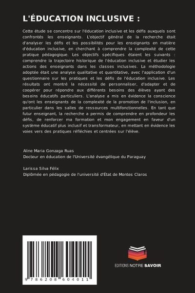 Cette étude se concentre sur l'éducation inclusive et les défis auxquels sont confrontés les enseignants. L'objectif général de la recherche était d'analyser les défis et les possibilités pour les enseignants en matière d'éducation inclusive, en cherchant à comprendre la complexité de cette pratique pédagogique. Les objectifs spécifiques étaient les suivants : comprendre la trajectoire historique de l'éducation inclusive et étudier les actions des enseignants dans les classes inclusives. La méthodologie adoptée était une analyse qualitative et quantitative, avec l'application d'un questionnaire sur les pratiques et les défis de l'éducation inclusive. Les résultats ont montré la nécessité de personnaliser, d'adapter et de coopérer pour répondre aux différents besoins des élèves ayant des besoins éducatifs particuliers. L'analyse a mis en évidence la conscience qu'ont les enseignants de la complexité de la promotion de l'inclusion, en particulier dans les salles de ressources multifonctionnelles. En tant que futur enseignant, la recherche a permis de comprendre en profondeur les défis, de renforcer ma formation et mon engagement en faveur d'un système éducatif plus inclusif et transformateur, en mettant en évidence les voies vers des pratiques réfléchies et centrées sur l'élève.