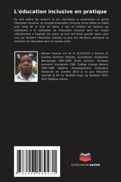 Ce livre aidera les lecteurs et les chercheurs à comprendre ce qu'est l'éducation inclusive. Le concept d'éducation inclusive cesse d'être un mythe avec l'aide de ce livre. En outre, il met en lumière les facteurs qui contribuent à la réalisation de l'éducation inclusive dans les écoles sélectionnées à Sogndal. En outre, ce livre est d'une grande valeur pour ceux qui étudient l'éducation spéciale et pour les décideurs politiques du ministère de l'éducation dans le monde entier.