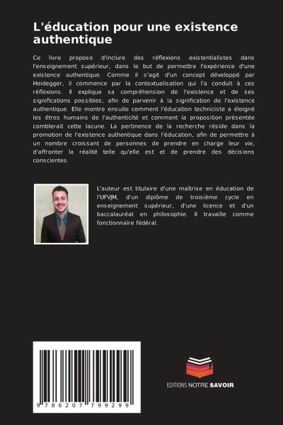 Ce livre propose d'inclure des réflexions existentialistes dans l'enseignement supérieur, dans le but de permettre l'expérience d'une existence authentique. Comme il s'agit d'un concept développé par Heidegger, il commence par la contextualisation qui l'a conduit à ces réflexions. Il explique sa compréhension de l'existence et de ses significations possibles, afin de parvenir à la signification de l'existence authentique. Elle montre ensuite comment l'éducation techniciste a éloigné les êtres humains de l'authenticité et comment la proposition présentée comblerait cette lacune. La pertinence de la recherche réside dans la promotion de l'existence authentique dans l'éducation, afin de permettre à un nombre croissant de personnes de prendre en charge leur vie, d'affronter la réalité telle qu'elle est et de prendre des décisions conscientes.